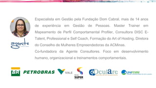 Este documento apresenta um workshop sobre perfis comportamentais ministrado por Tatiana Santarelli. O workshop discute a origem e importância dos perfis comportamentais para entender as diferenças entre as pessoas e melhorar a comunicação e desempenho nas organizações. São apresentados os principais perfis comportamentais segundo a metodologia DISC e como aplicá-los em processos seletivos, treinamentos e avaliação de equipes.