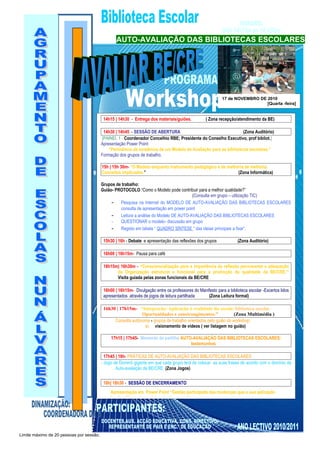 O documento descreve o programa de um workshop sobre auto-avaliação de bibliotecas escolares. O workshop inclui sessões sobre a importância da auto-avaliação, discussões em grupo sobre como um modelo pode melhorar a qualidade, e atividades práticas como visitas guiadas e jogos para aplicar conceitos de auto-avaliação.