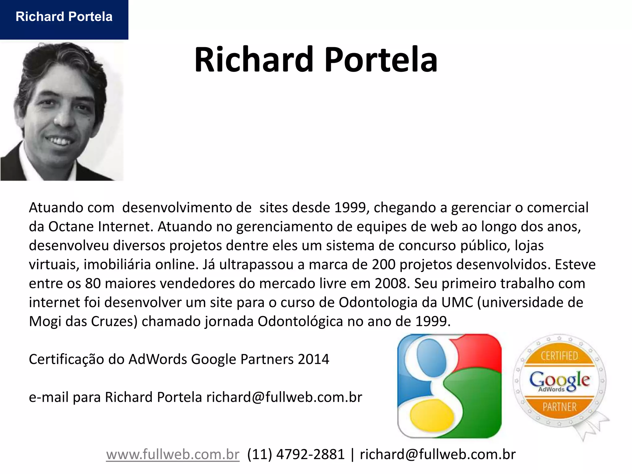 Richard Portela trabalha com desenvolvimento de sites desde 1999. Ele gerenciou equipes de web e desenvolveu diversos projetos ao longo dos anos, como sistemas de concurso público, lojas virtuais e imobiliárias online, totalizando mais de 200 projetos. Foi um dos 80 maiores vendedores do Mercado Livre em 2008. Seu primeiro trabalho na internet foi desenvolver um site para a faculdade de Odontologia da UMC em 1999.