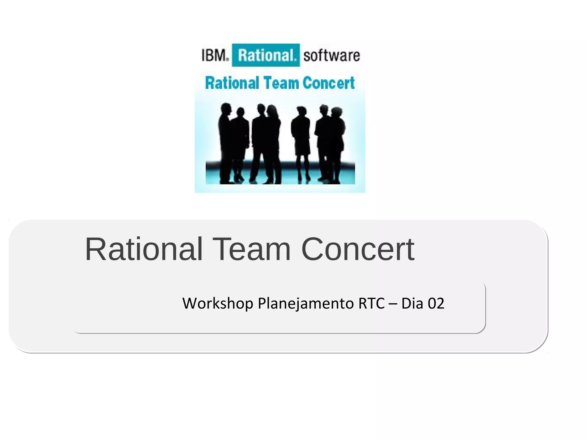 Este documento apresenta uma agenda para um workshop sobre Rational Team Concert (RTC). O workshop irá abordar tópicos como planos, painéis, snapshots e configuração de visibilidade. Os participantes aprenderão a criar e configurar diferentes tipos de planos, como backlogs e sprints. Também irão conhecer os tipos de painéis disponíveis e como adicionar widgets e planos neles. Será mostrado como criar snapshots dos planos e compará-los. Por fim, haverá exercícios práticos para criação e configuração de plan