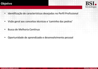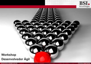 O documento descreve um workshop para desenvolvedores ágeis, abordando os seguintes tópicos: 1) objetivos do workshop em identificar características desejadas no perfil profissional e conceitos técnicos; 2) perfil comportamental desejado como trabalho em equipe e comunicação; 3) perfil técnico incluindo orientação a objetos, SQL, XP, TDD e controle de versão.