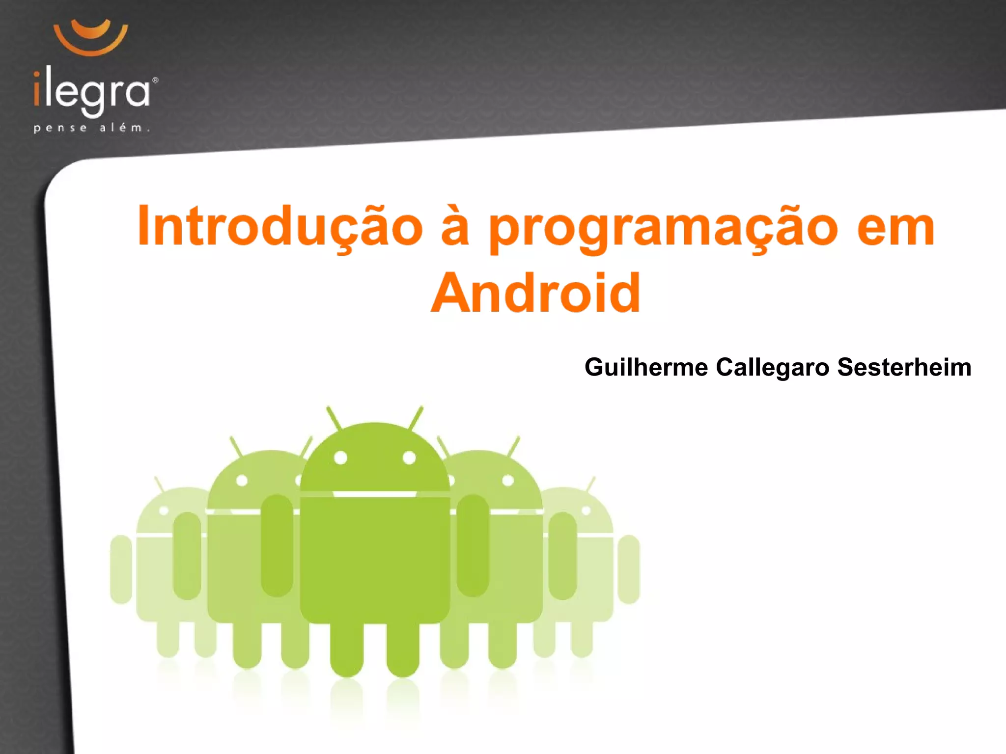 O documento apresenta informações sobre o sistema operacional Android, incluindo sua história, desenvolvimento de aplicativos e ambientes de programação. Também discute perspectivas para desenvolvedores e oportunidades no mercado.