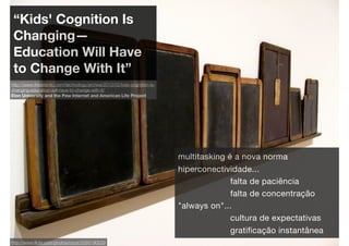 O documento discute como a cognição e comportamento das crianças estão mudando na era digital, exigindo novas habilidades para o século 21 e uma educação adaptada aos tempos atuais. A escola precisa ensinar competências como resolução colaborativa de problemas, pesquisa online e avaliação crítica de informações, ou else as crianças aprenderão essas habilidades fora da escola. A tecnologia pode ser um motor de inovação na educação se envolver todos os agentes do sistema educativo.