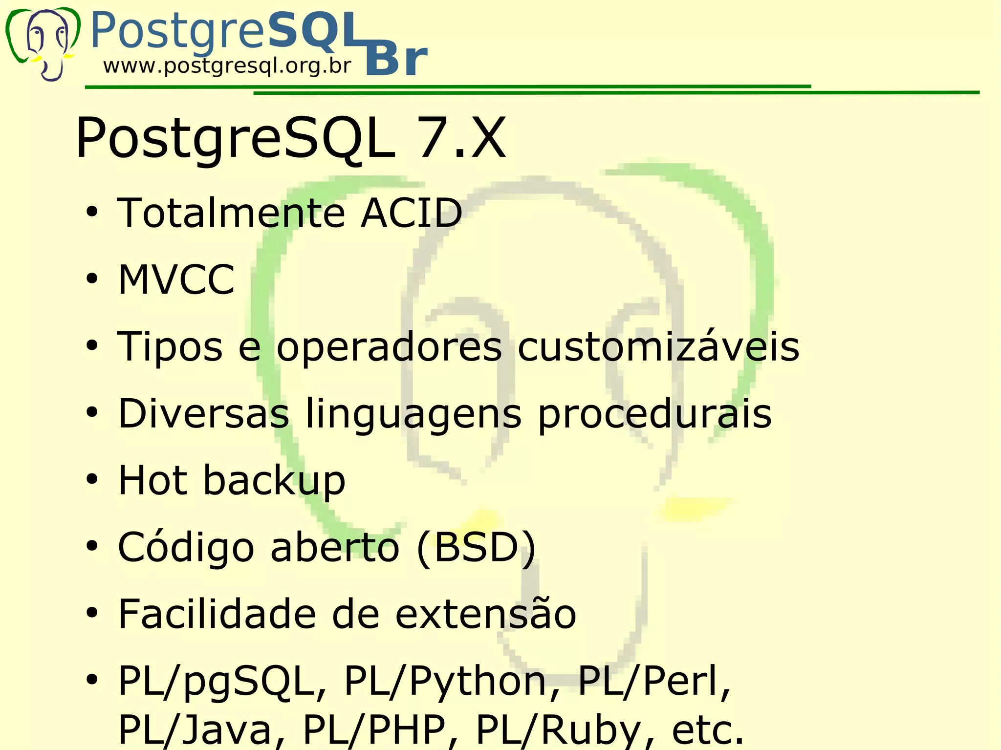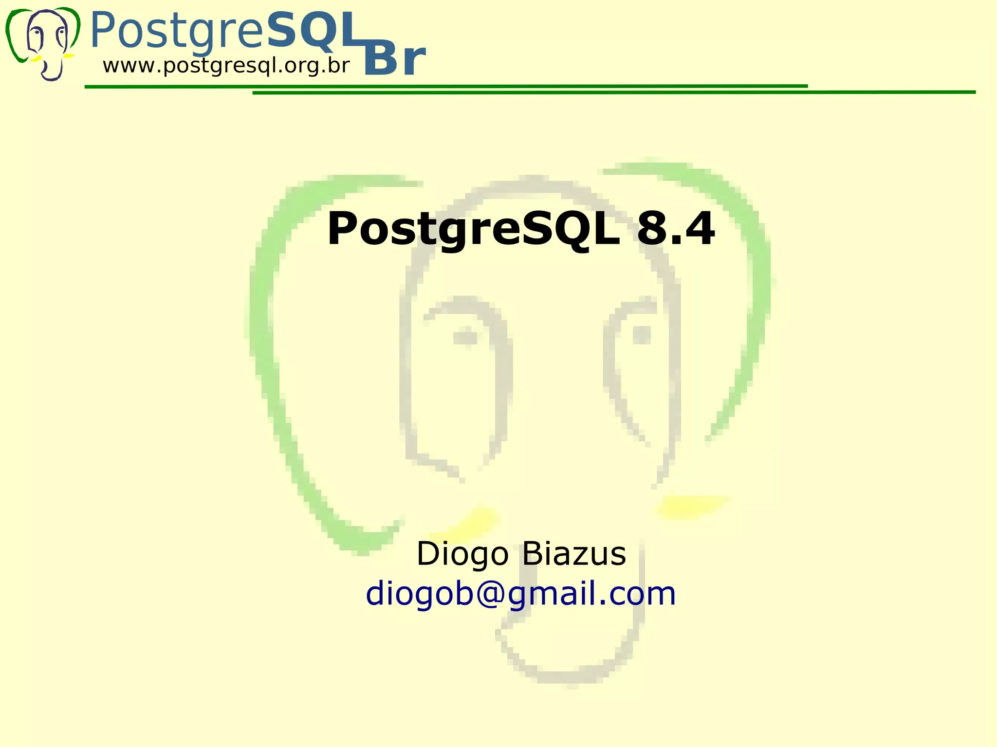O documento fornece um resumo das principais características e novidades das versões 7.X, 8.0, 8.3 e 8.4 do PostgreSQL, incluindo detalhes sobre instalação, configuração e uso de recursos como funções PL/pgSQL, gatilhos, domínios e replicação.