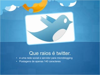 O documento fornece dicas sobre como usar o Twitter para fins profissionais, incluindo conectar-se com clientes e parceiros, obter feedback, e promover eventos e conteúdo. Ele lista 18 maneiras de usar o Twitter para melhorar o engajamento, visibilidade e relacionamentos de negócios.