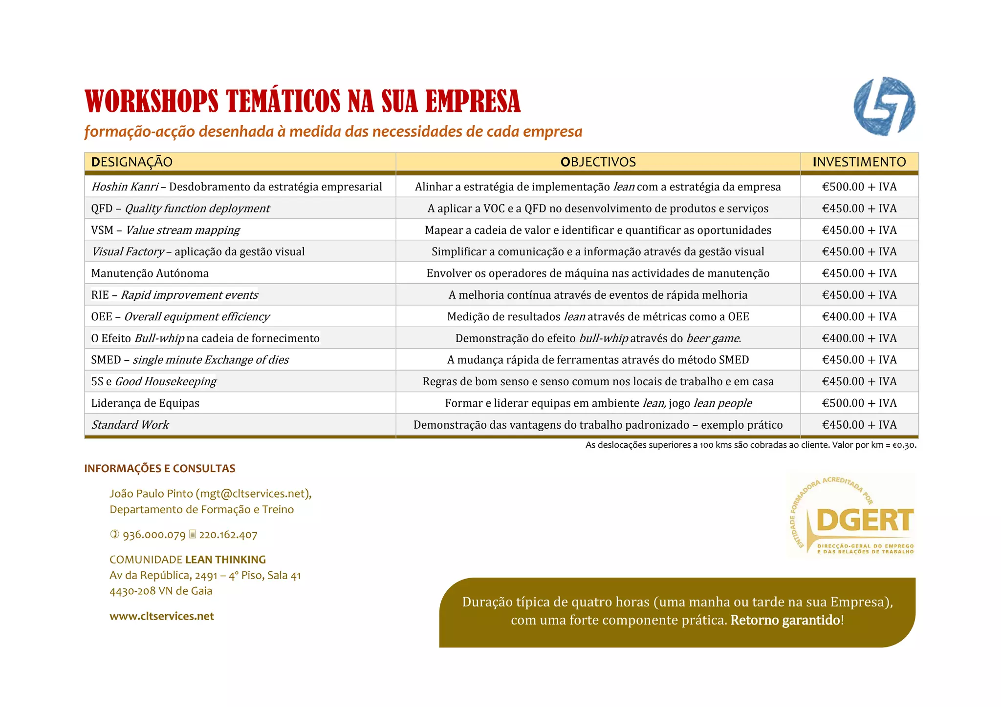 Este documento lista vários workshops temáticos sobre técnicas lean que uma empresa pode contratar, incluindo Hoshin Kanri, QFD, VSM e OEE. Os workshops variam em preço de €400-500 e cobrem tópicos como mapeamento de fluxo de valor, medição de desempenho e envolvimento de funcionários. Contatos são fornecidos para obter mais informações.