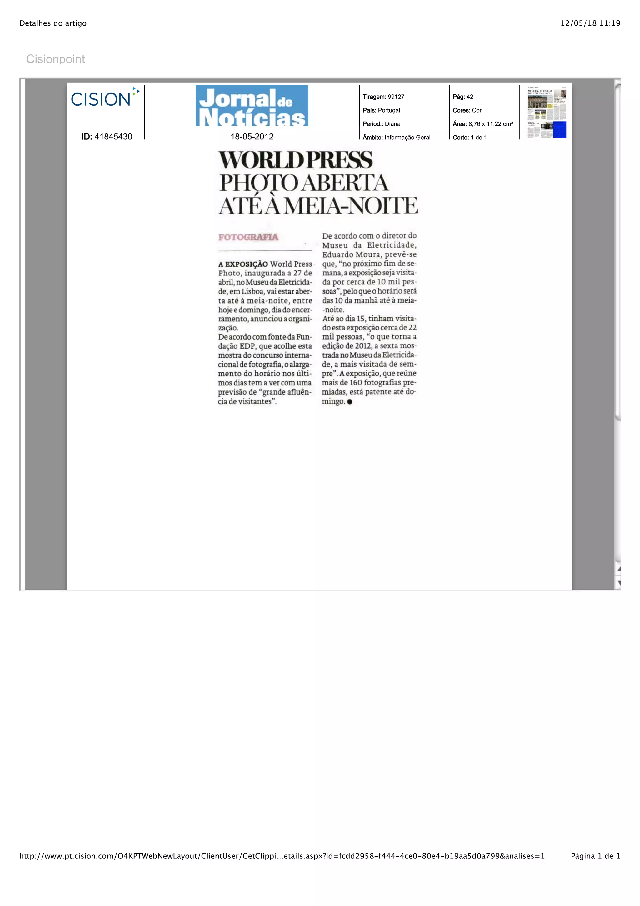 O documento fornece detalhes sobre um artigo publicado em 12 de maio de 2018 na página 42 de um jornal português com tiragem de 99.127 exemplares, contendo informações gerais.
