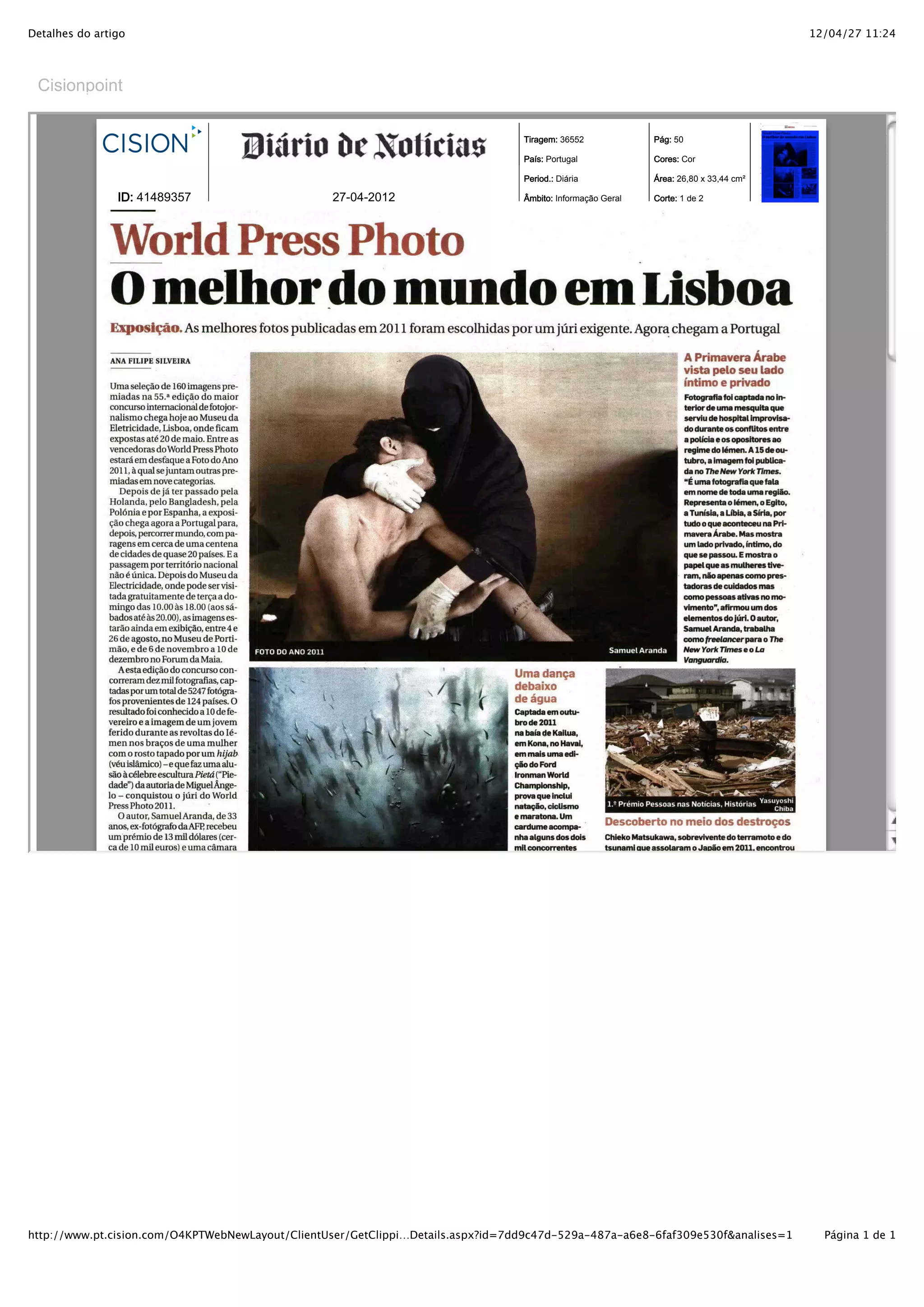 O documento fornece detalhes sobre um artigo publicado em 12 de abril de 2027 na página 50 de um jornal português com tiragem de 36.552 exemplares, contendo informações gerais.