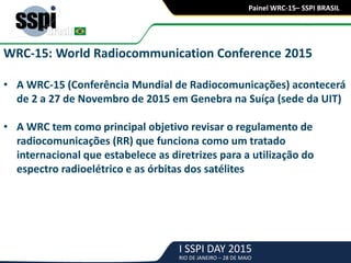 O documento descreve um painel sobre a WRC-15 realizado no Rio de Janeiro em 28 de maio. O painel discutiu as principais propostas para a conferência, incluindo requerimentos de espectro para serviços móveis e satélites. Os participantes debateram tópicos como a necessidade de harmonização do espectro e a possibilidade de migração de serviços da Banda C para outras faixas.