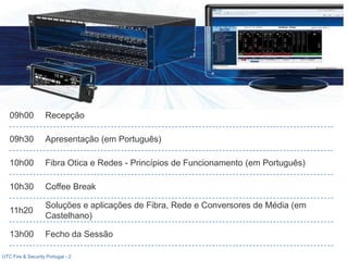 O documento apresenta a agenda de uma sessão sobre fibra ótica e redes de segurança que ocorrerá em português e espanhol. A agenda inclui apresentações sobre princípios de funcionamento de fibra ótica e redes, soluções e aplicações de fibra, redes e conversores de mídia. Haverá também um coffee break.