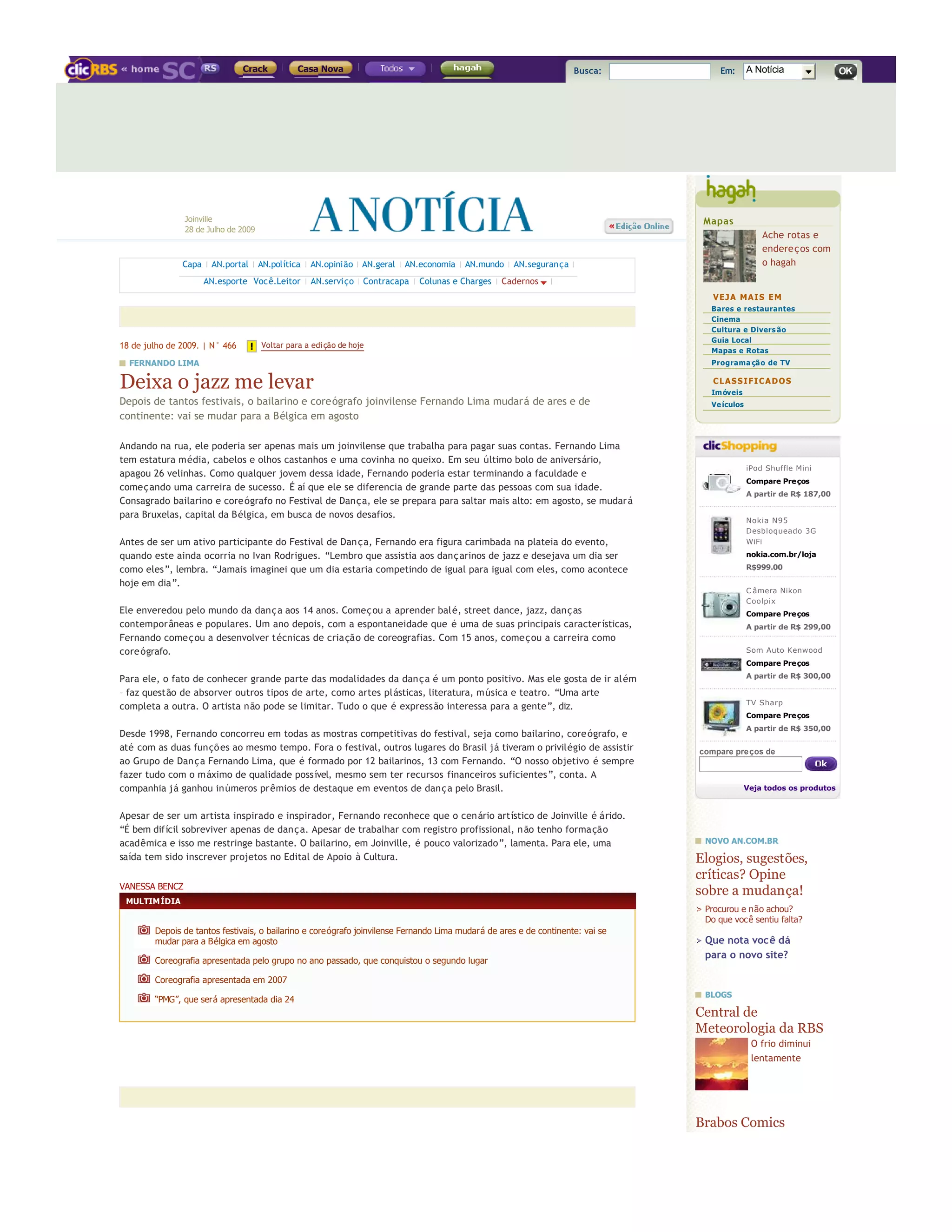 O documento descreve a trajetória do bailarino e coreógrafo joinvilense Fernando Lima, que se destacou no Festival de Dança de Joinville. Em agosto, ele irá se mudar para Bruxelas, na Bélgica, em busca de novos desafios em sua carreira. Apesar de seu sucesso, Fernando reconhece as dificuldades de ser artista em Joinville, onde há pouco apoio e valorização para a dança.