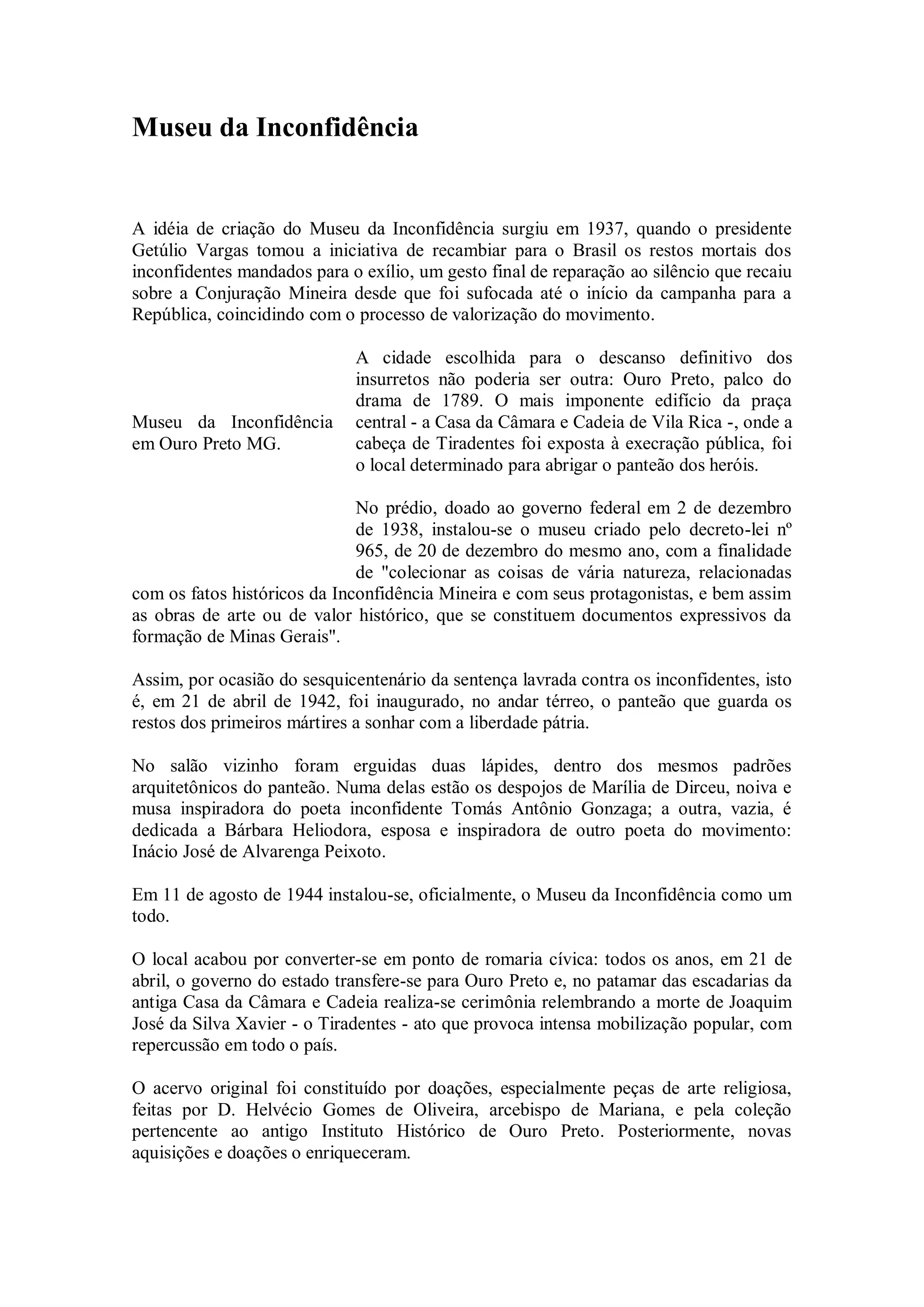 O Museu da Inconfidência foi criado em 1937 para abrigar os restos mortais dos líderes da Inconfidência Mineira e contar a história desse movimento. Localizado no imponente prédio da antiga Câmara e Cadeia de Vila Rica em Ouro Preto, o museu abriga um rico acervo sobre a Inconfidência e a cultura colonial mineira. Atualmente, o museu é referência na preservação do patrimônio cultural e histórico de Minas Gerais.
