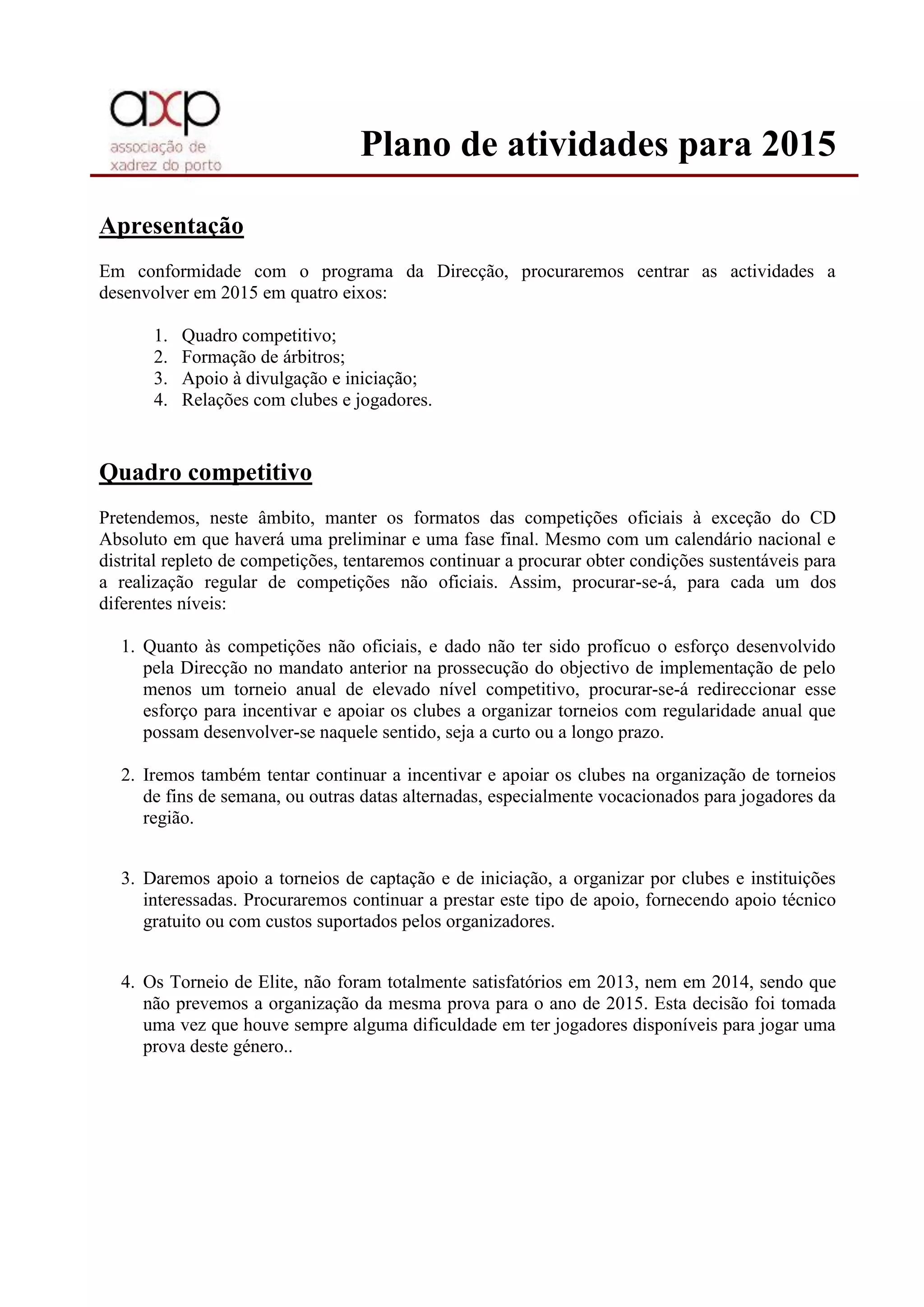 O plano de atividades para 2015 da Associação de Xadrez do Porto centra-se em quatro eixos: competições oficiais e não oficiais, formação de árbitros, apoio à divulgação e iniciação do xadrez, e relações com clubes e jogadores. Pretende-se manter os formatos das competições oficiais e incentivar clubes a organizarem torneios não oficiais, bem como apoiar a formação de árbitros e divulgação do xadrez em escolas e comunidades.