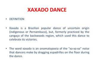 O documento descreve a dança Xaxado: uma dança popular brasileira originária do Nordeste, praticada originalmente pelos cangaceiros e que se tornou popular na década de 1920. O Xaxado consiste em uma fila indiana com versos cantados e movimentos laterais e de sapateado, simbolizando gestos de guerra. Posteriormente, as mulheres também passaram a participar da dança.
