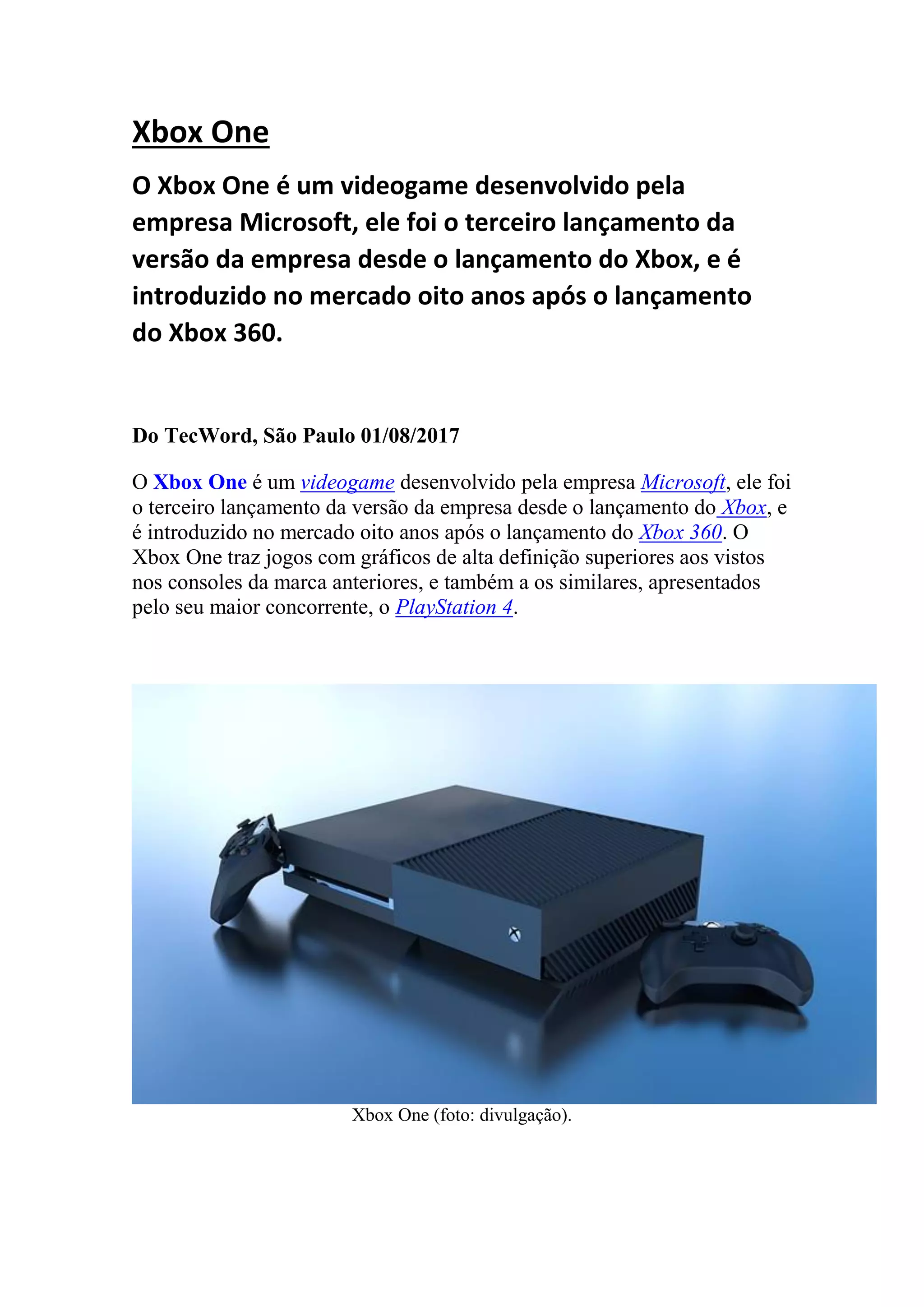 O Xbox One é o terceiro console desenvolvido pela Microsoft, lançado oito anos após o Xbox 360. Ele oferece gráficos em alta definição superiores aos consoles anteriores da Microsoft e seu principal concorrente, o PlayStation 4. O Xbox One foi anunciado em 2013 e lançado no mesmo ano por um preço entre US$ 499-R$ 2.299.