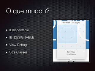 O documento discute as novas funcionalidades do Xcode 6, incluindo IBInspectable, IB_DESIGNABLE e Size Classes que permitem criar interfaces visuais de forma mais flexível e direta no Interface Builder. O View Debugger permite visualizar camadas e índices de componentes em tempo de execução sem ferramentas externas.