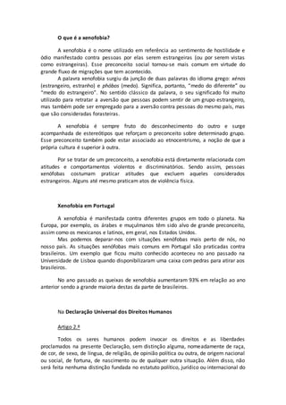 A xenofobia é o medo ou ódio de estrangeiros. Ela surge do desconhecimento e estereótipos sobre outros grupos e está relacionada à violência e discriminação. Em Portugal, brasileiros são alvos comuns de xenofobia. A Declaração Universal dos Direitos Humanos garante que todos têm os mesmos direitos independentemente de nacionalidade.