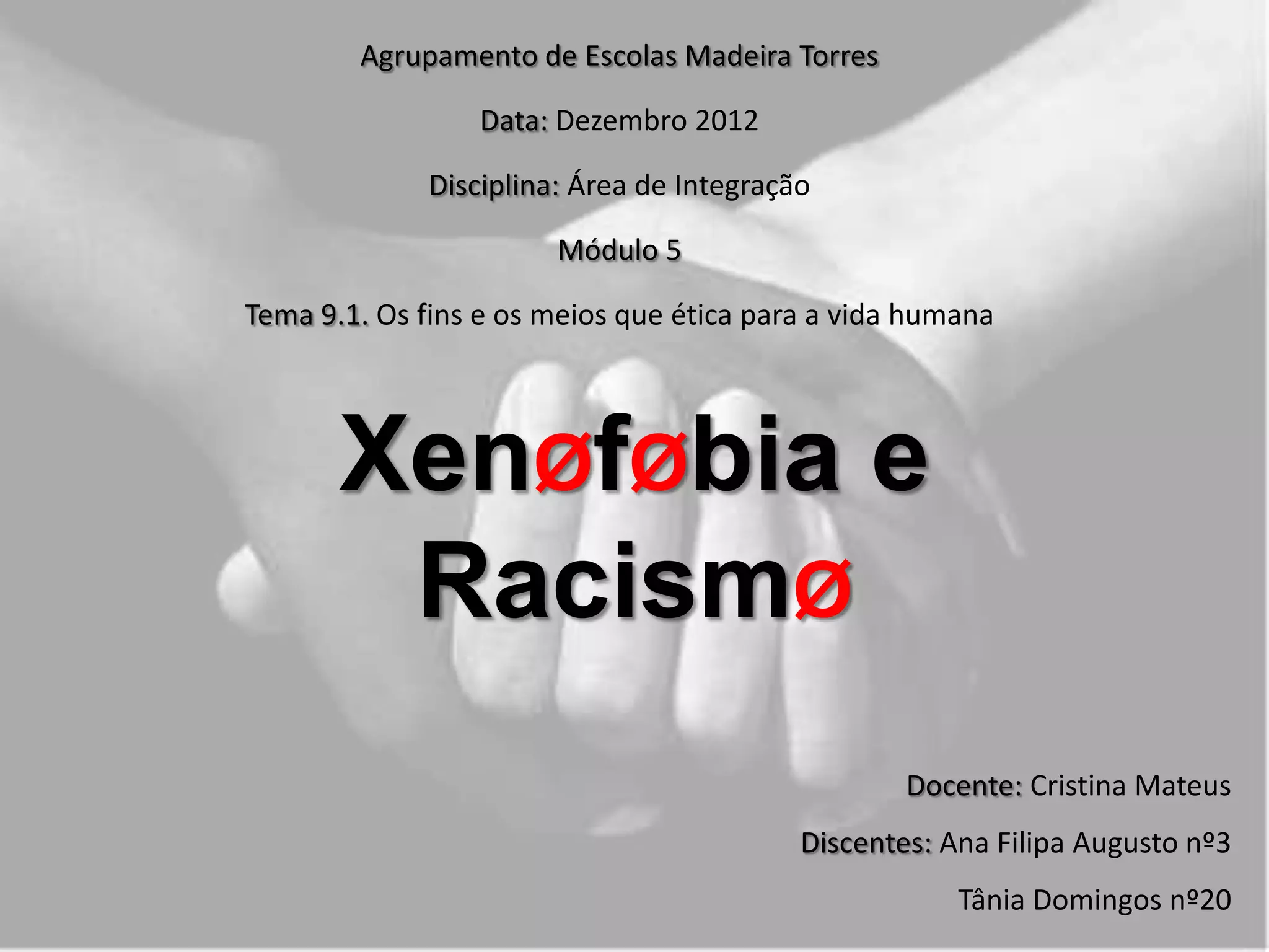Este documento discute os tópicos da xenofobia, racismo e apartheid. Apresenta as origens e manifestações destes fenômenos, bem como exemplos históricos e atuais. Também aborda medidas para combater a discriminação e promover a igualdade entre os povos.
