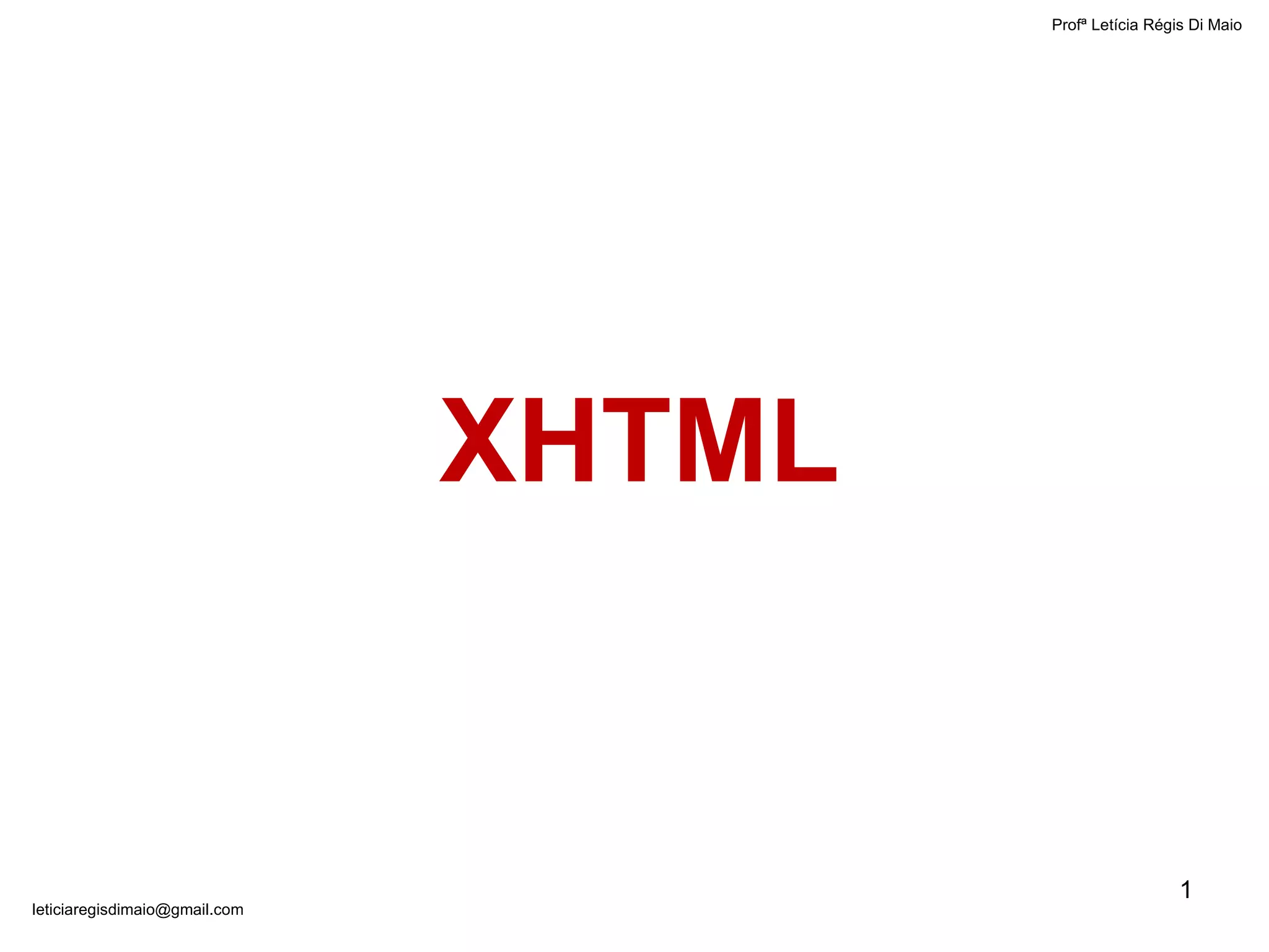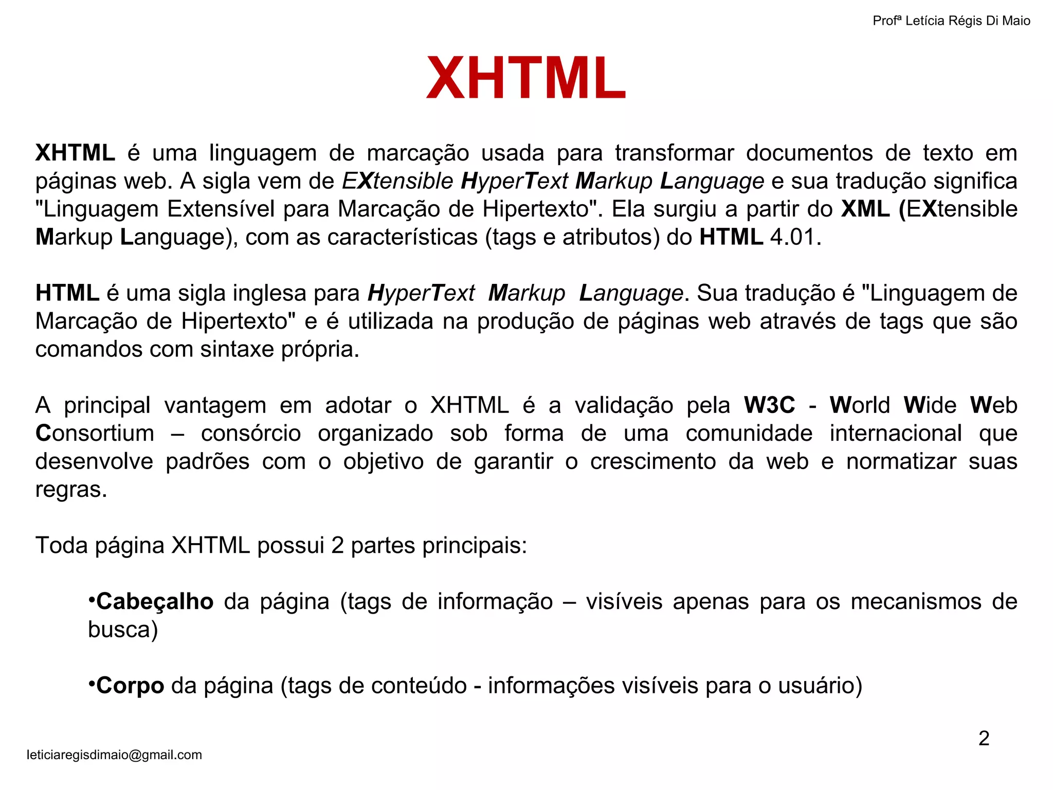 O documento discute o XHTML, uma linguagem de marcação usada para criar páginas web. Ele explica que o XHTML é baseado no XML e HTML 4.01, e contém tags para estruturar o cabeçalho e corpo da página. Também fornece exemplos de código XHTML com comentários explicando as tags e atributos usados.