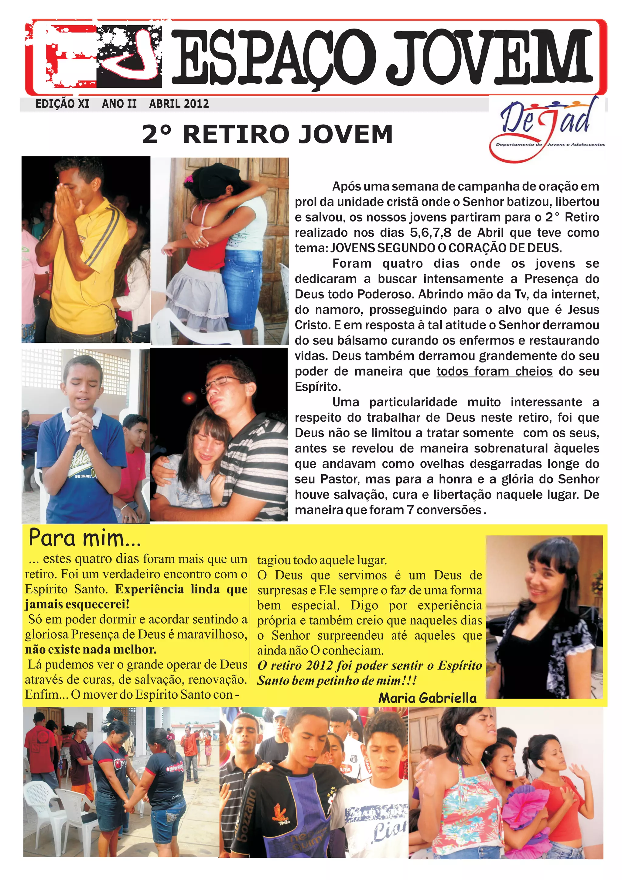 O documento descreve um retiro espiritual realizado por jovens com o tema "Jovens segundo o coração de Deus". Durante o retiro, houve conversões, curas e libertações espirituais como resultado da busca dos jovens pela presença de Deus e do derramamento do Espírito Santo.
