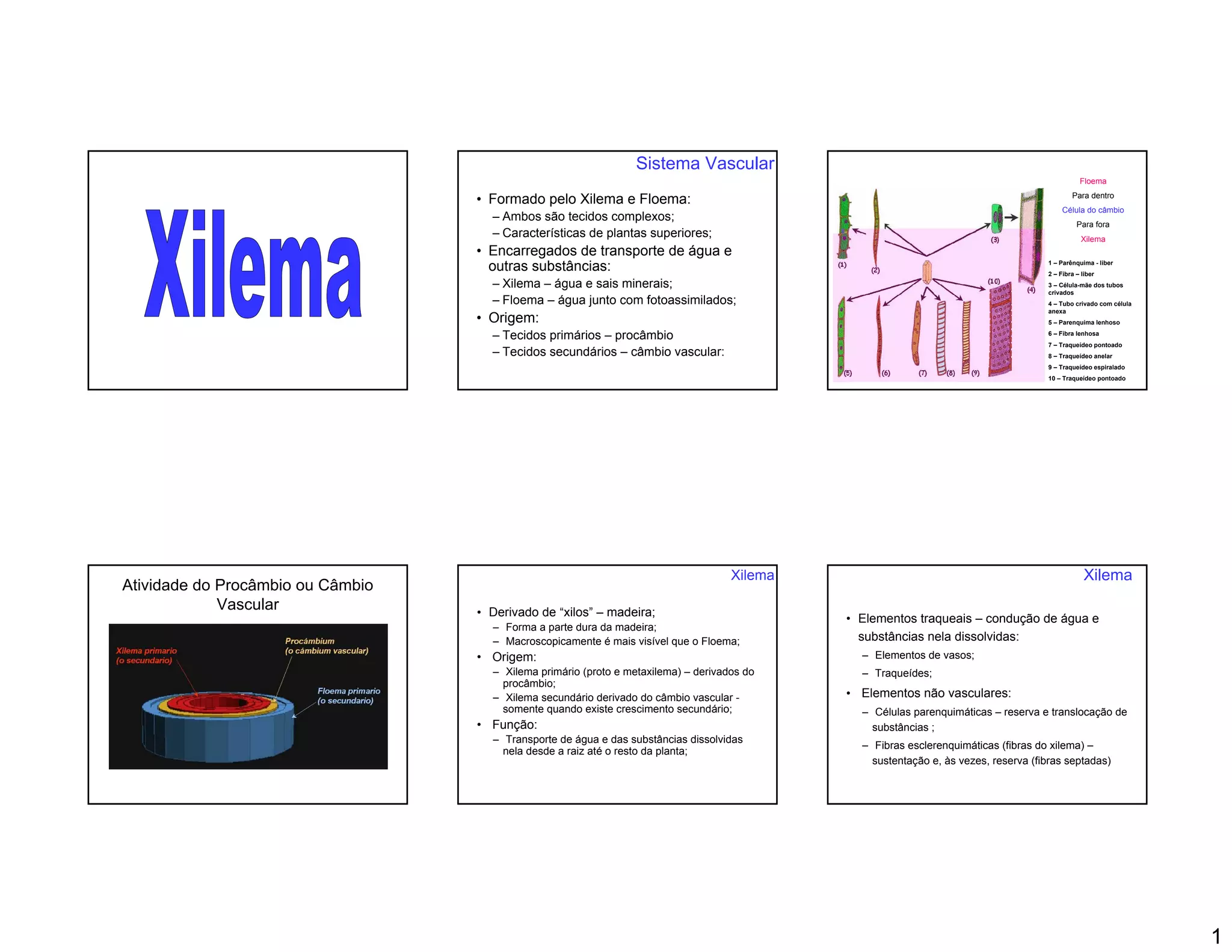 3) Os elementos do xilema incluem vasos, traqueídes, células parenquimáticas e fibras, que auxiliam na condução, armazenamento e sustentação.