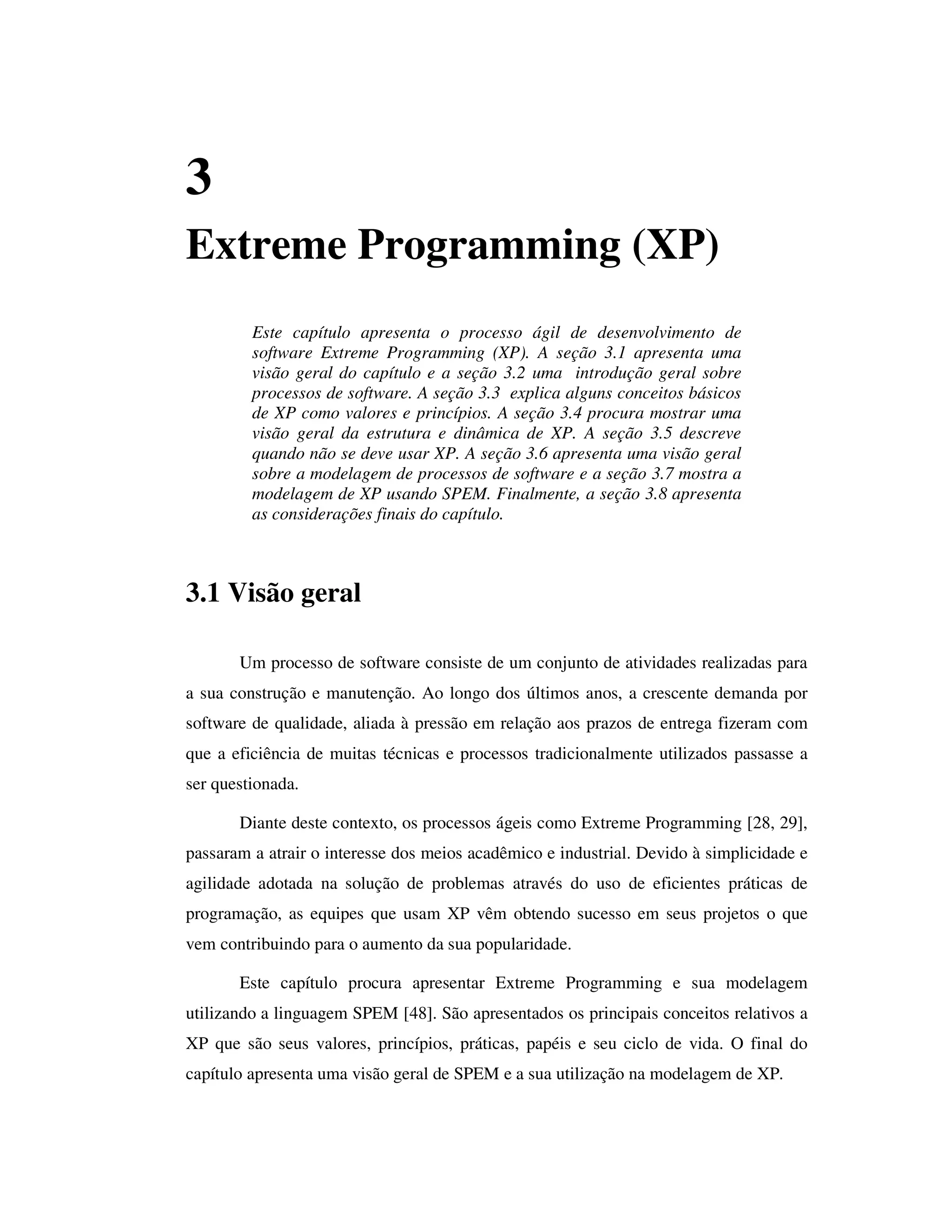 Este documento fornece uma visão geral do processo ágil Extreme Programming (XP). Resume os principais conceitos como valores, princípios, práticas, papéis e ciclo de vida de XP. Também descreve quando não se deve usar XP e apresenta uma introdução à modelagem de processos de software usando a linguagem SPEM.