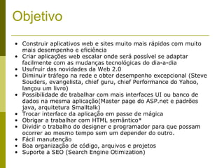 O documento apresenta o xpt framework, visando construir aplicativos web mais rápidos e eficientes, utilizando boas práticas de programação e novas tecnologias. Enfatiza a facilidade de manutenção, uso de PHP e MySQL, bem como técnicas para otimização de desempenho, seguindo orientações de especialistas. Também aborda design patterns como MVC e a importância de URLs amigáveis e abstração de banco de dados.