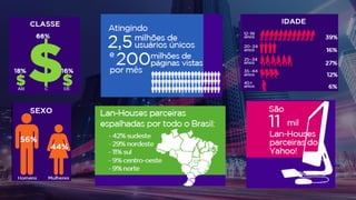 O documento apresenta as soluções de publicidade do Yahoo para anunciantes, incluindo plataformas digitais, formatos de anúncios e serviços de segmentação de audiência. Destaca-se a oferta unificada de conteúdo, redes sociais, mídia paga e orgânica do Yahoo para atingir os objetivos das campanhas dos anunciantes.