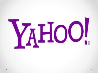O documento resume a história do Yahoo!, incluindo seus fundadores Jerry Yang e David Filo da Universidade de Stanford, seu crescimento desde 1996 com a aquisição de 83 empresas, e sua expansão de portfólio ao longo dos anos.