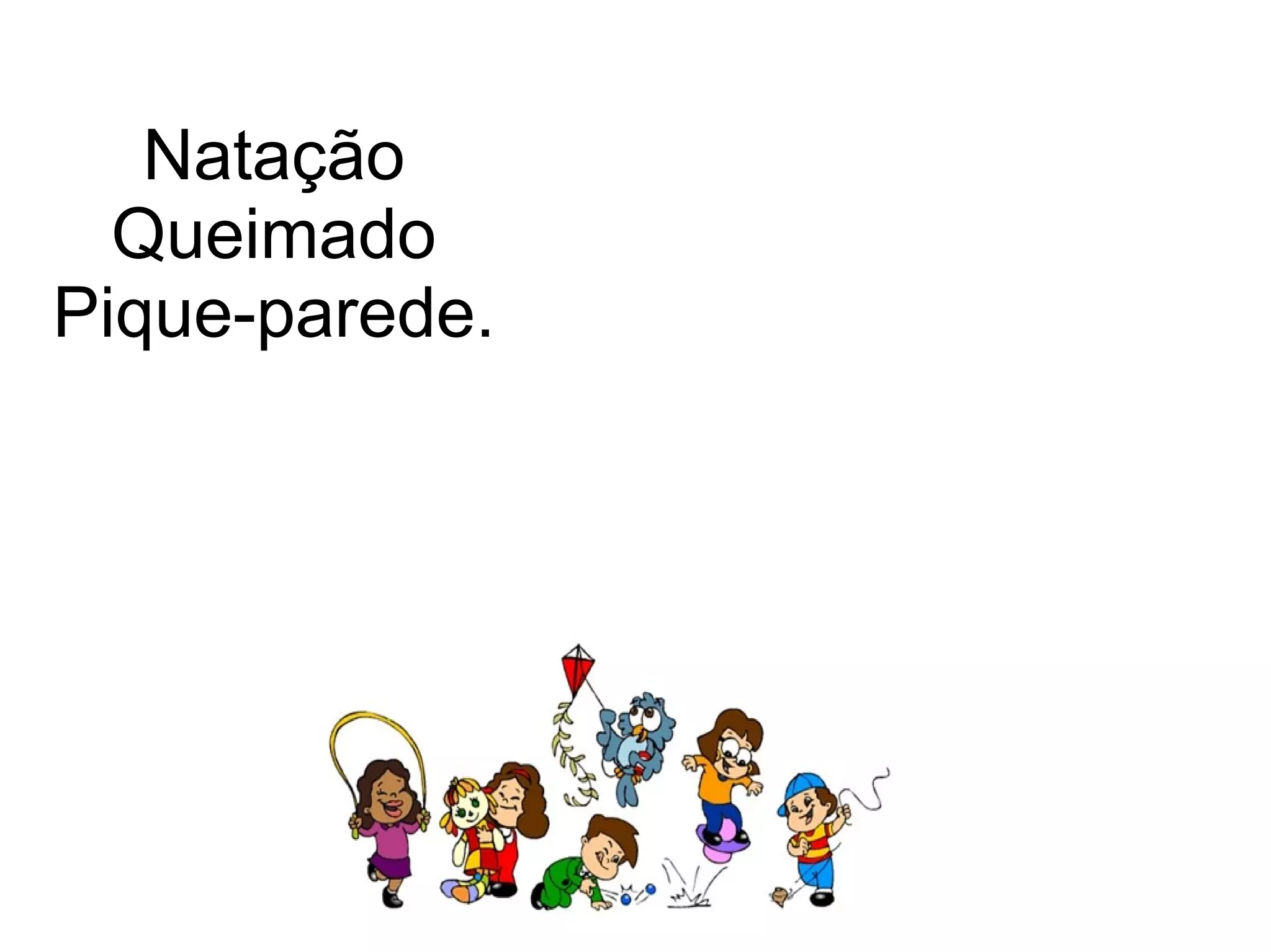 O documento descreve três atividades físicas: natação, que é um esporte saudável; queimado, um jogo onde se transpira ao ser atingido por uma bola; e pique-parede, onde se deve ficar grudado em uma parede para não ser pegado.