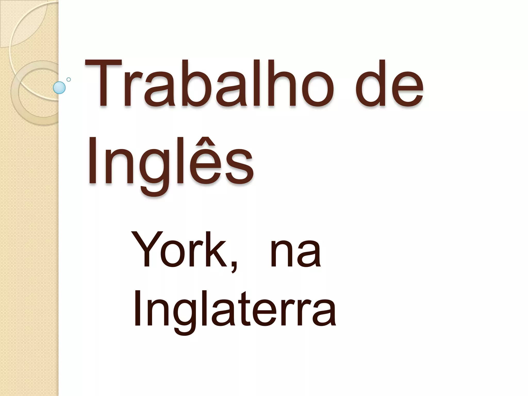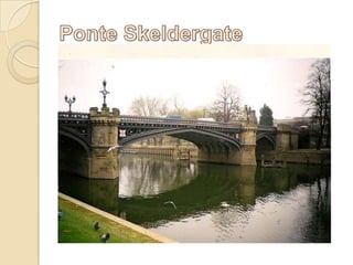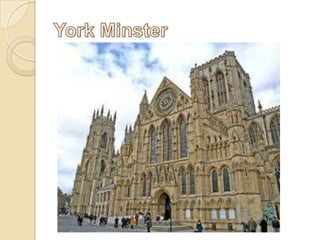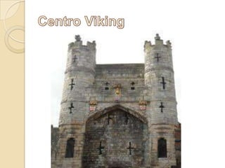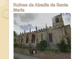 Este documento descreve vários pontos turísticos e históricos da cidade de York, na Inglaterra, incluindo a Ponte de York, a Abadia de Santa Maria, a Catedral de York Minster, a Torre de Clifford, o Museu do Castelo de York e o Museu de Yorkshire. A cidade também teve grande influência viking e hoje possui um centro dedicado a pesquisas sobre esse período.