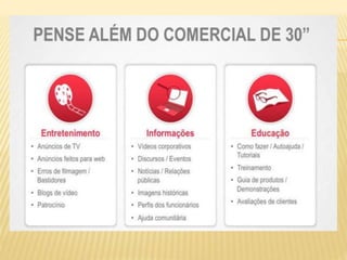 O documento descreve a história e o crescimento do YouTube, desde sua fundação em 2005 por Chen e Hurley até se tornar a maior plataforma de compartilhamento de vídeos do mundo, recebendo milhões de uploads e visualizações diariamente. Também apresenta suas principais funcionalidades e formas de monetização por meio de publicidade.