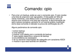 O documento descreve comandos Linux relacionados a gerenciamento de pacotes e sistemas de arquivos, incluindo cpio para backups, umask para permissões, DPKG/RPM para gerenciamento de pacotes, e espelhos e repositórios. Exercícios práticos são fornecidos para recuperar um sistema Debian, adicionar e formatar partições, e montá-las automaticamente.