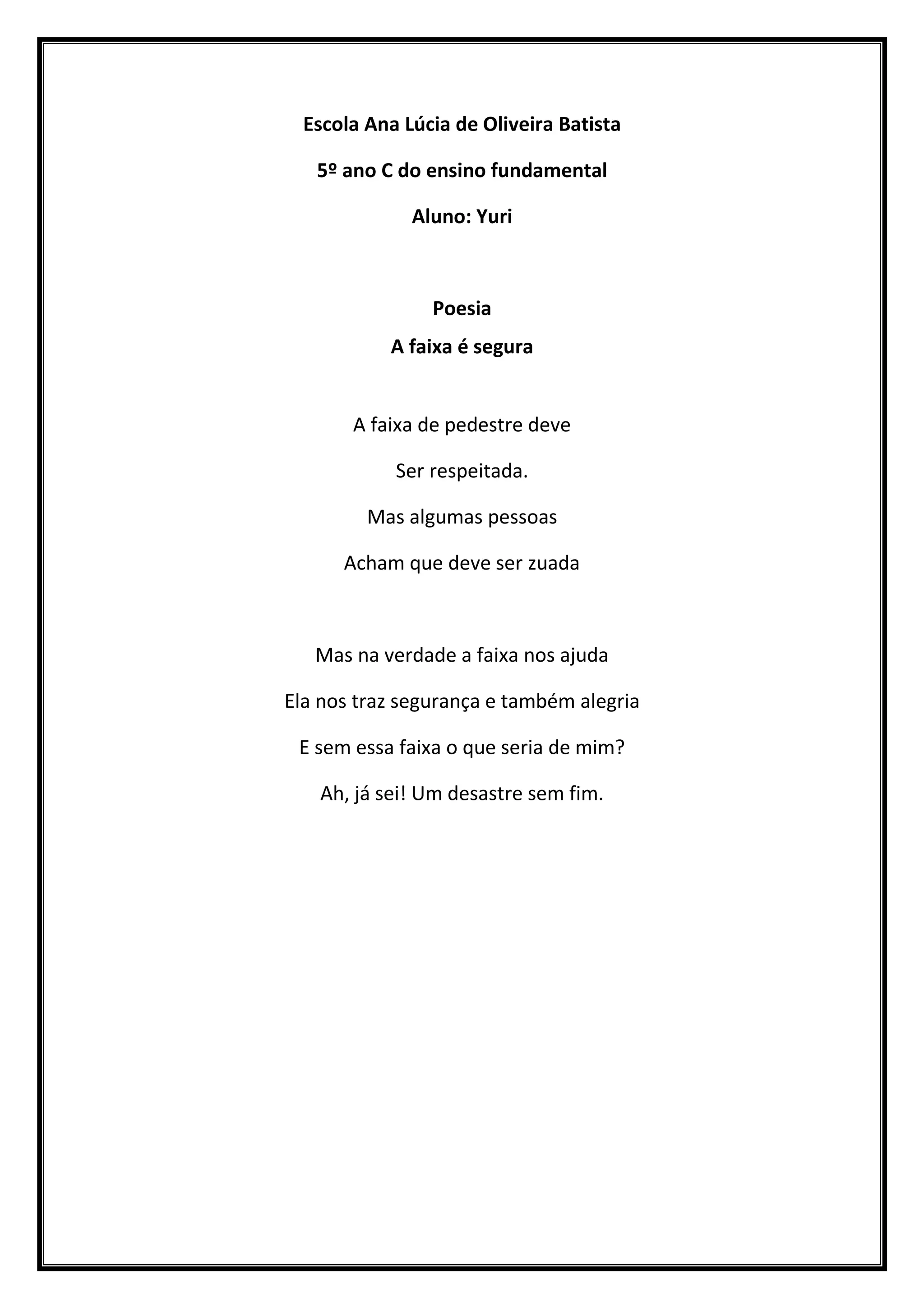 A poesia destaca a importância da faixa de pedestre para a segurança, dizendo que ela traz segurança e alegria e que sem ela seria um desastre sem fim para os pedestres atravessarem a rua.