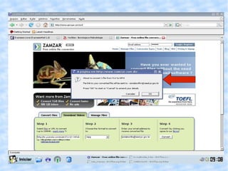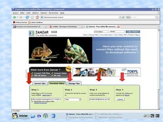 Este documento fornece instruções sobre como baixar vídeos online, converter seus formatos para serem reproduzidos na TV Multimídia e salvá-los em um pendrive para apresentação. Ele lista sites de vídeo e conversão gratuitos e passo a passo para usar o site Zamzar para converter vídeos, recebê-los por e-mail e salvá-los no pendrive.