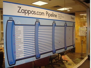 Este documento descreve a cultura da empresa Zappos, fundada por Tony Hsieh. A cultura da Zappos valoriza acima de tudo o atendimento ao cliente e a felicidade dos funcionários. A empresa oferece $2.000 para os funcionários que queiram sair após o treinamento inicial, para garantir que só permaneçam aqueles que realmente acreditem nos valores da empresa. A cultura da Zappos é baseada em 10 valores centrais como criar diversão, ser apaixonado e determinado, e construir relacionamentos abertos e honestos