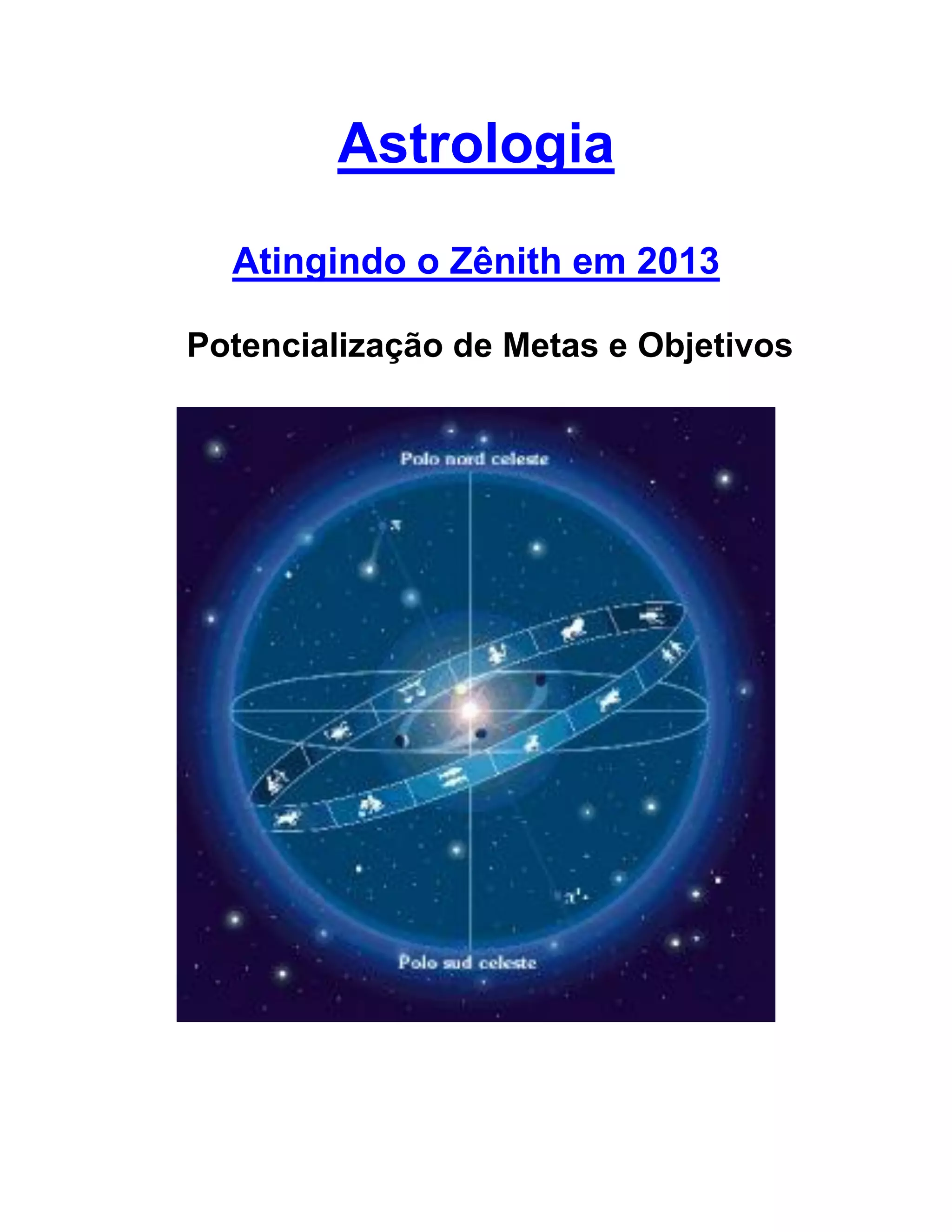 O documento discute a astrologia e como atingirá seu ápice em 2013. Explica que montanhas representam o "umbigo da Terra" por onde fluem energias cósmicas e cada uma governa um ciclo evolutivo. A montanha de Moreb em Minas Gerais representará o último ciclo ariano. Também estabelece analogias entre astrologia e montanhas, com o zênith representando o ápice e discute que 2013 será regido por Capricórnio e Saturno.