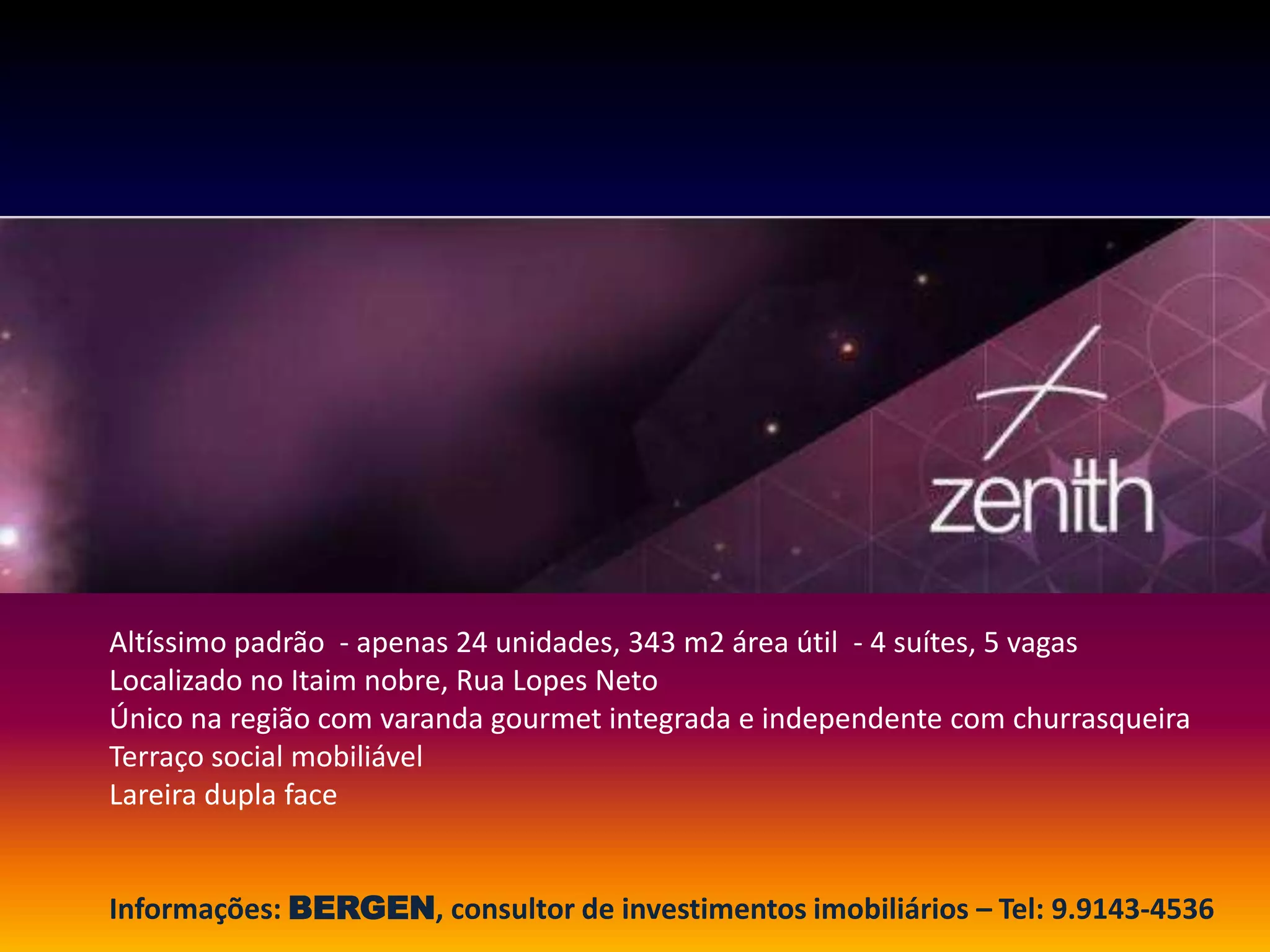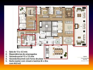 O documento apresenta um empreendimento imobiliário de alto padrão no Itaim Nobre, contendo 24 unidades com 4 suítes e 5 vagas, além de diversas comodidades como piscina, fitness e quadra de tênis. O projeto arquitetônico é exclusivo e permite personalização de plantas e acabamentos, atendendo às preferências dos futuros moradores. A área útil de cada unidade varia, com destaque para uma cobertura dúplex de 500 m2.