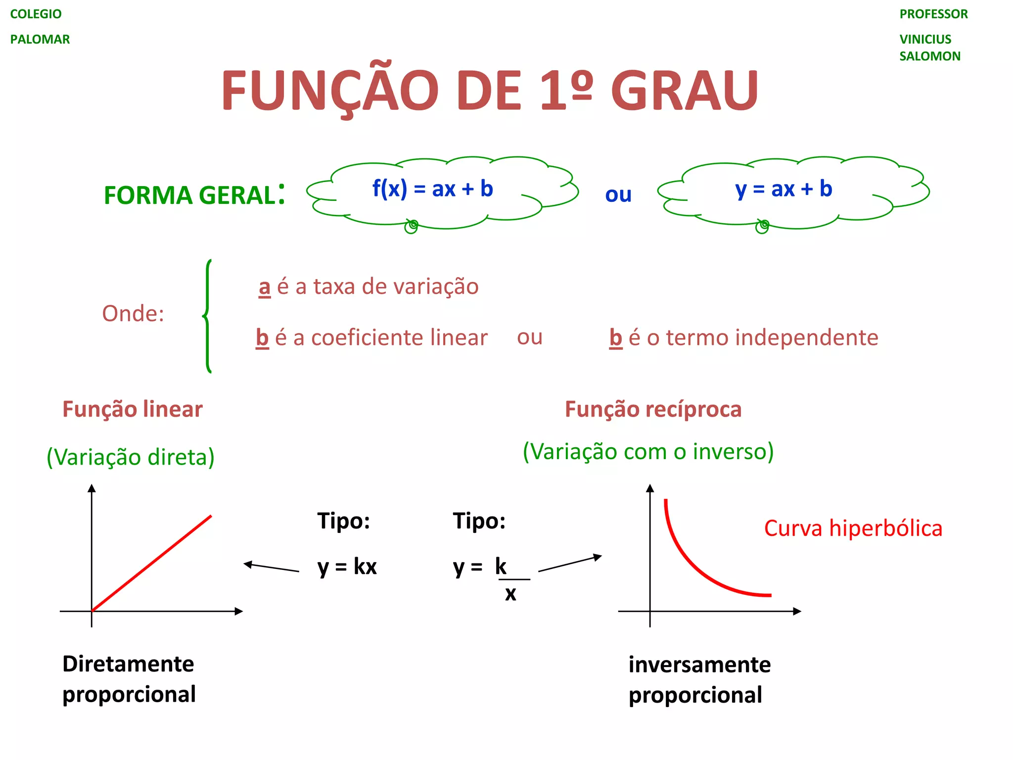 O documento resume as principais características e conceitos de funções do 1o grau, incluindo sua forma geral, tipos de variação, crescimento e decrescimento, raiz, estudo do sinal e como determinar uma função a partir de seu gráfico.
