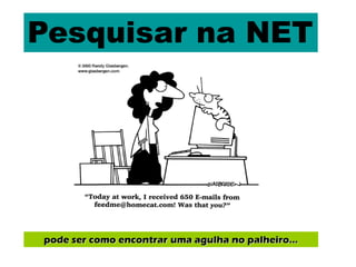 O documento discute estratégias para realizar pesquisas eficazes na internet, incluindo escolher palavras-chave relevantes, usar sinais e operadores booleanos, e avaliar a credibilidade das fontes. Recomenda verificar se a informação é atualizada, se o autor é um especialista, e se há referências bibliográficas.