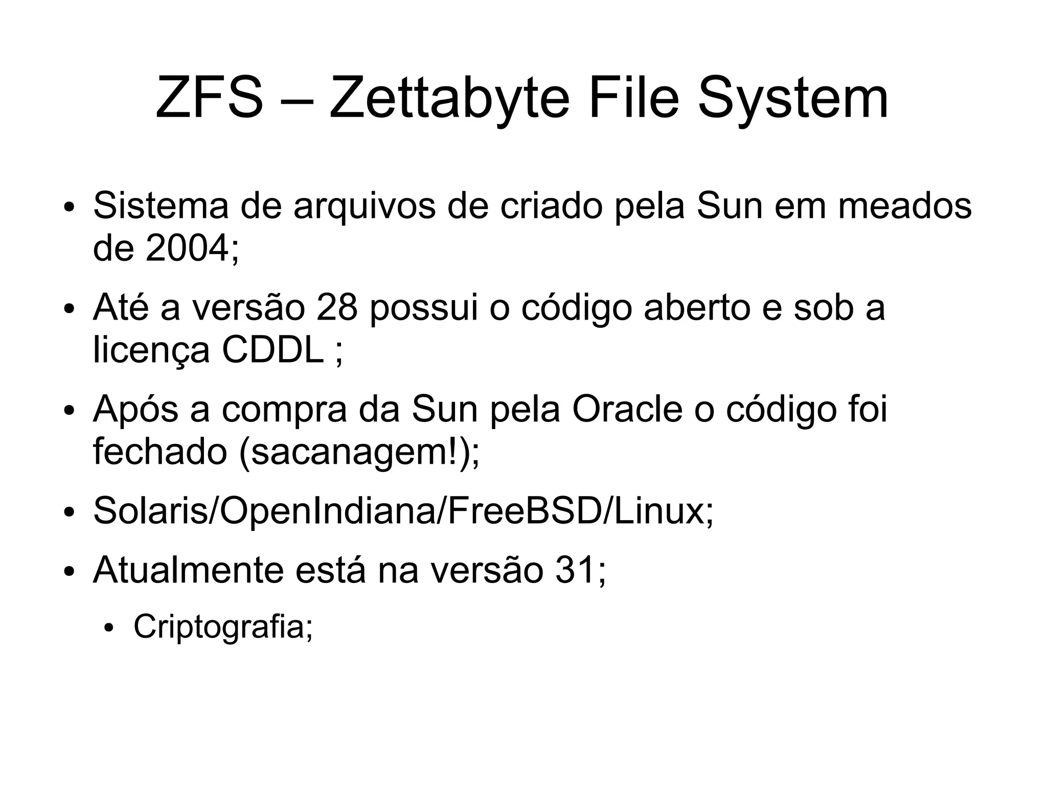 ZFS é um sistema de arquivos criado pela Sun em 2004 que oferece alta capacidade de armazenamento, integridade e recuperação de dados por meio da criação de pools de discos. Ele pode ser usado em Solaris, OpenIndiana, FreeBSD e Linux e oferece funcionalidades como criptografia, compactação, snapshots e mirror/RAID.