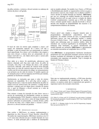 O documento descreve uma nova abordagem para implementar futures no Java chamada DBLFuture. DBLFuture melhora a facilidade de uso de paralelismo baseado em futures no Java, bem como o desempenho e escalabilidade. DBLFuture explora anotações para indicar variáveis locais que podem conter resultados de chamadas de função futuras. A JVM executa essas chamadas sequencialmente inicialmente e pode posteriormente dividir a pilha em novas threads para execução paralela, evitando sobrecarga de objetos como Callable e Future sempre que possível.