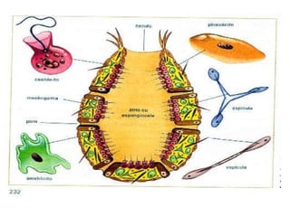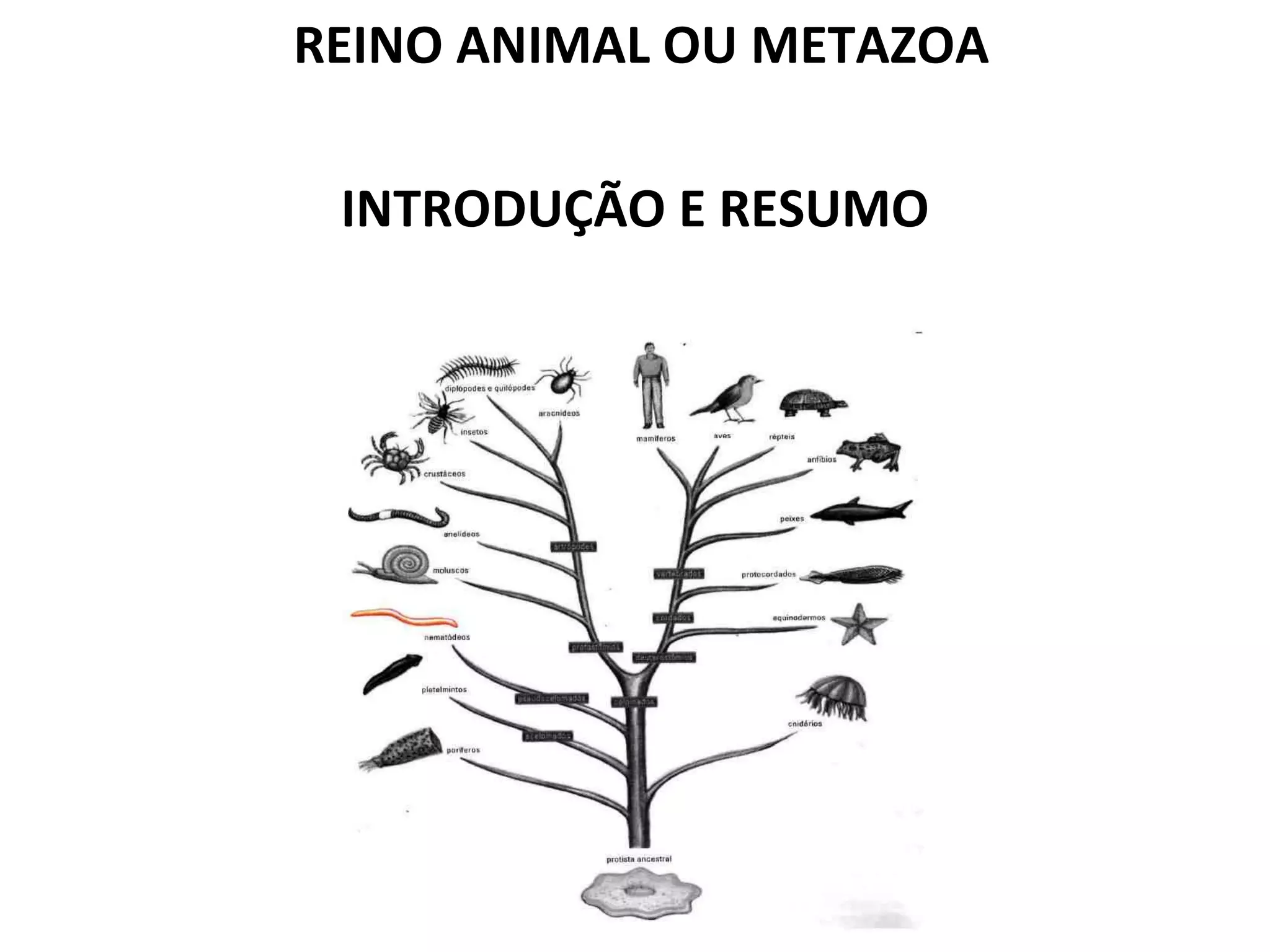 O documento resume as principais características dos filos do reino animal, incluindo poríferos, cnidários, platelmintos, nemertelmintos, anelídeos, moluscos, artrópodes, equinodermos e cordados. Descreve as estruturas e habitats típicos de cada filo.