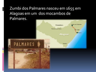 Zumbi dos Palmares nasceu em 1655 em Alagoas e foi capturado aos 15 anos, mas fugiu de volta para o Quilombo de Palmares. Ele se destacou no Quilombo e se tornou o General de Armas aos 17 anos. Após a morte de Ganga Zumba, Zumbi assumiu o comando do Quilombo de Palmares, que resistiu até ser destruído em 1695, quando Zumbi foi capturado e decapitado.