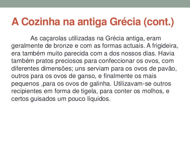 6. 6. A Cozinha na antiga Grécia (cont.) Outros servidores estavam também ocupados na preparação de refeições ou de serviço de mesa. No IV século A.C., os cozinheiros de Atenas, eram geralmente escravos. Apesar da sua vil condição eles tinham na vila um lugar considerável, pois era nas casas em que se servia melhor comida, que afluíam os poetas e homens de letras.