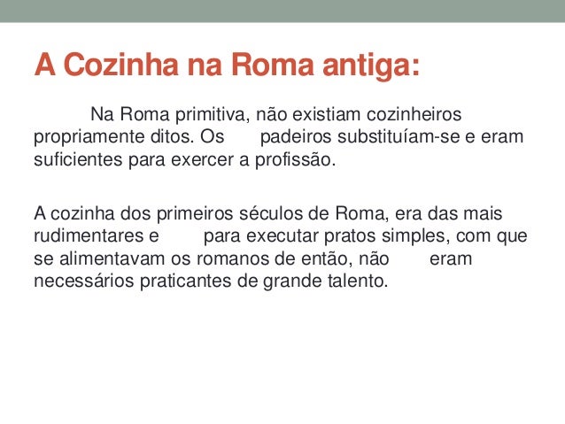 11. 11. A Cozinha na Roma antiga: Na Roma primitiva, não existiam cozinheiros propriamente ditos. Os padeiros substituíam-se e eram suficientes para exercer a profissão. A cozinha dos primeiros séculos de Roma, era das mais rudimentares e para executar pratos simples, com que se alimentavam os romanos de então, não eram necessários praticantes de grande talento.