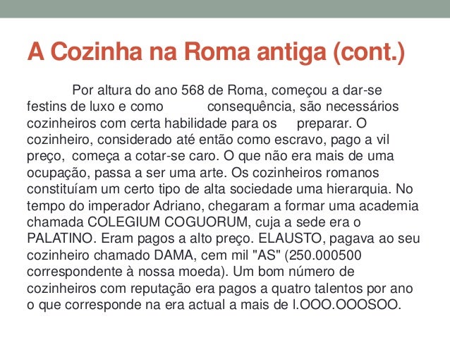 12. 12. A Cozinha na Roma antiga (cont.) Por altura do ano 568 de Roma, começou a dar-se festins de luxo e como consequência, são necessários cozinheiros com certa habilidade para os preparar. O cozinheiro, considerado até então como escravo, pago a vil preço, começa a cotar-se caro. O que não era mais de uma ocupação, passa a ser uma arte. Os cozinheiros romanos constituíam um certo tipo de alta sociedade uma hierarquia. No tempo do imperador Adriano, chegaram a formar uma academia chamada COLEGIUM COGUORUM, cuja a sede era o PALATINO. Eram pagos a alto preço. ELAUSTO, pagava ao seu cozinheiro chamado DAMA, cem mil "AS" (250.000500 correspondente à nossa moeda). Um bom número de cozinheiros com reputação era pagos a quatro talentos por ano o que corresponde na era actual a mais de l.OOO.OOOSOO.