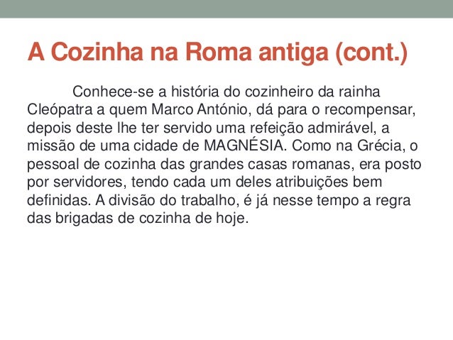 13. 13. A Cozinha na Roma antiga (cont.) Conhece-se a história do cozinheiro da rainha Cleópatra a quem Marco António, dá para o recompensar, depois deste lhe ter servido uma refeição admirável, a missão de uma cidade de MAGNÉSIA. Como na Grécia, o pessoal de cozinha das grandes casas romanas, era posto por servidores, tendo cada um deles atribuições bem definidas. A divisão do trabalho, é já nesse tempo a regra das brigadas de cozinha de hoje.