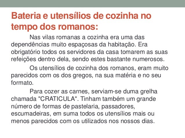 15. 15. Bateria e utensílios de cozinha no tempo dos romanos: Nas vilas romanas a cozinha era uma das dependências muito espaçosas da habitação. Era obrigatório todos os servidores da casa tomarem as suas refeições dentro dela, sendo estes bastante numerosos. Os utensílios de cozinha dos romanos, eram muito parecidos com os dos gregos, na sua matéria e no seu formato. Para cozer as carnes, serviam-se duma grelha chamada "CRATICULA". Tinham também um grande número de formas de pastelaria, passadores, escumadeiras, em suma todos os utensílios mais ou menos parecidos com os utilizados nos nossos dias.