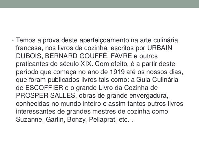 17. 17. • Temos a prova deste aperfeiçoamento na arte culinária francesa, nos livros de cozinha, escritos por URBAIN DUBOIS, BERNARD GOUFFÉ, FAVRE e outros praticantes do século XIX. Com efeito, é a partir deste período que começa no ano de 1919 até os nossos dias, que foram publicados livros tais como: a Guia Culinária de ESCOFFIER e o grande Livro da Cozinha de PROSPER SALLES, obras de grande envergadura, conhecidas no mundo inteiro e assim tantos outros livros interessantes de grandes mestres de cozinha como Suzanne, Garlin, Bonzy, Pellaprat, etc. .